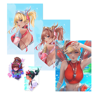 Bundles available, either the two Pink Mercy variants or a triple Mercy bundle including the Lifeguard print and either a Dva or Kiriko sticker.